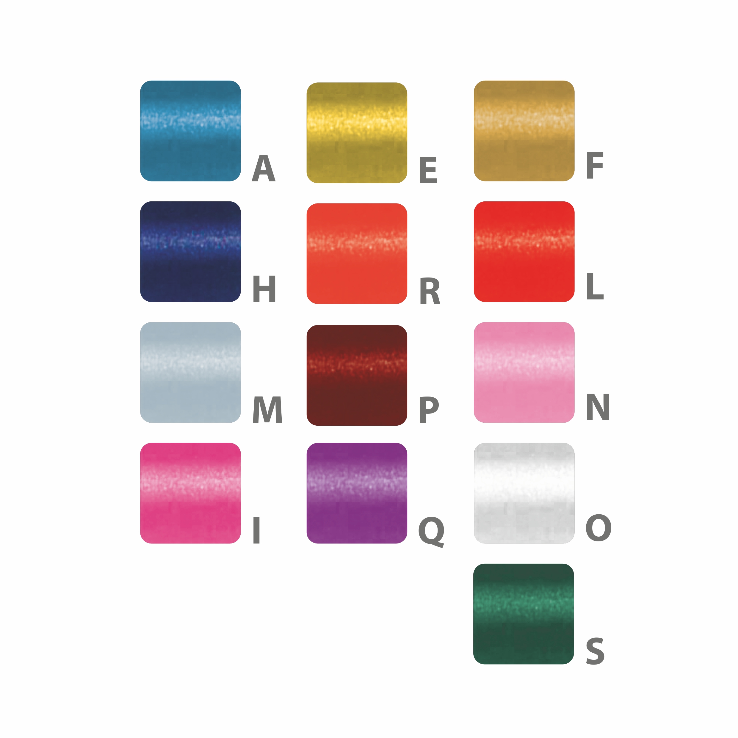 Azzurro, Bianco, Blu scuro, Fuxia, Rosa, Rosa fragola, Viola, Panna, Oro, Rosso, Argento, Verde,