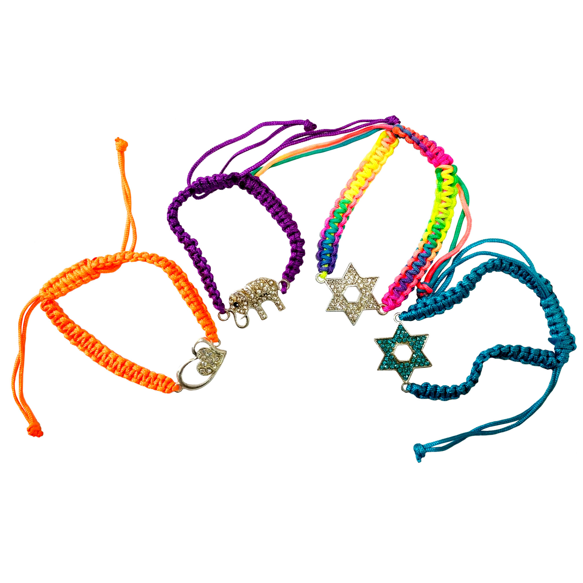 ✨ Bracciali in corda colorata – Realizzati con cordini intrecciati in tonalità vivaci, impreziositi da uno strass centrale scintillante e dotati di una chiusura regolabile per adattarsi a qualsiasi polso.